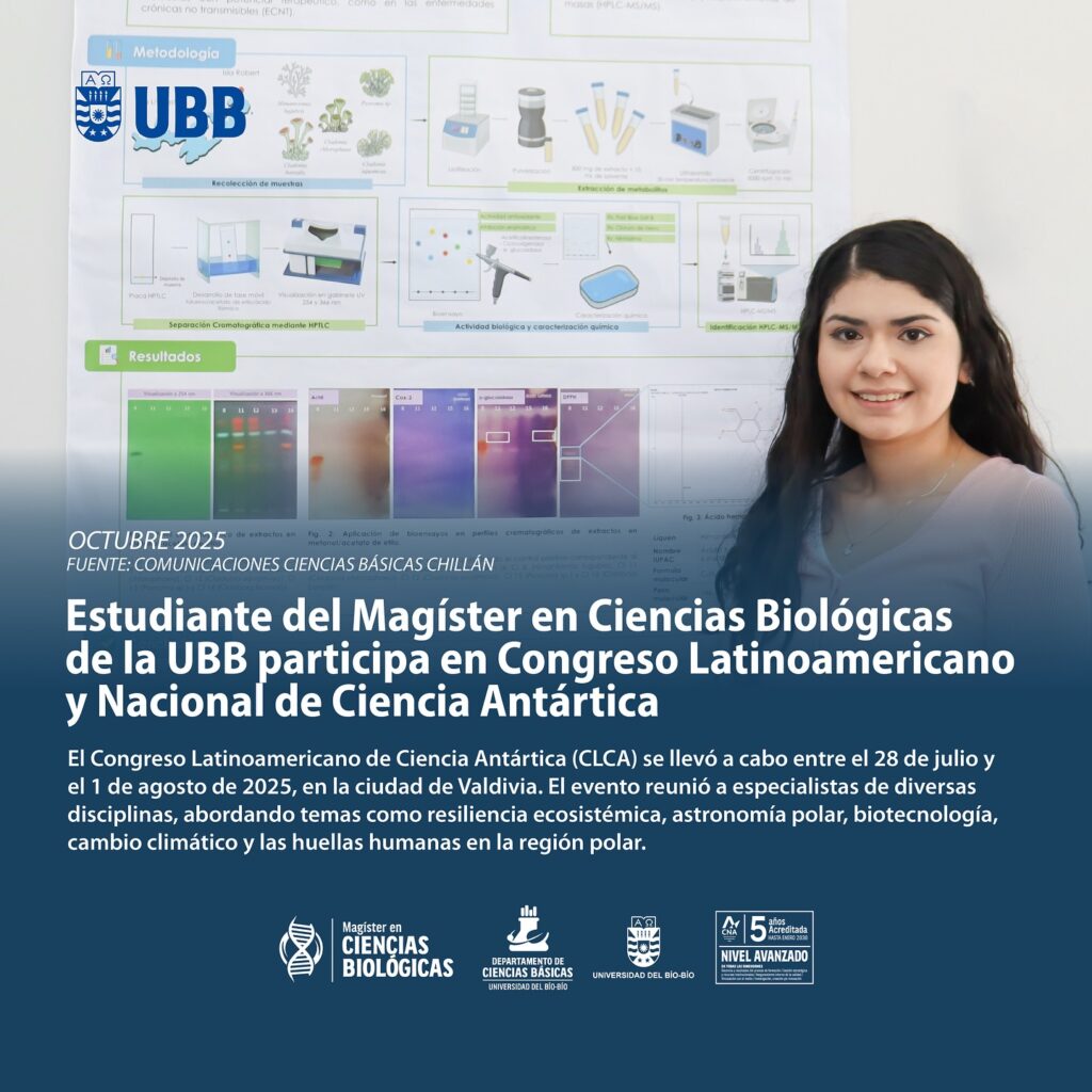 Valentina destacó su experiencia en el congreso: “La presentación generó interés entre los asistentes, quienes valoraron positivamente la relevancia del estudio en líquenes. Fue una experiencia enriquecedora que nos permitió aportar conocimiento sobre el valor biotecnológico de los líquenes antárticos, destacando la importancia de la biodiversidad polar como fuente natural de moléculas con aplicaciones potenciales en el ámbito de la salud humana”.